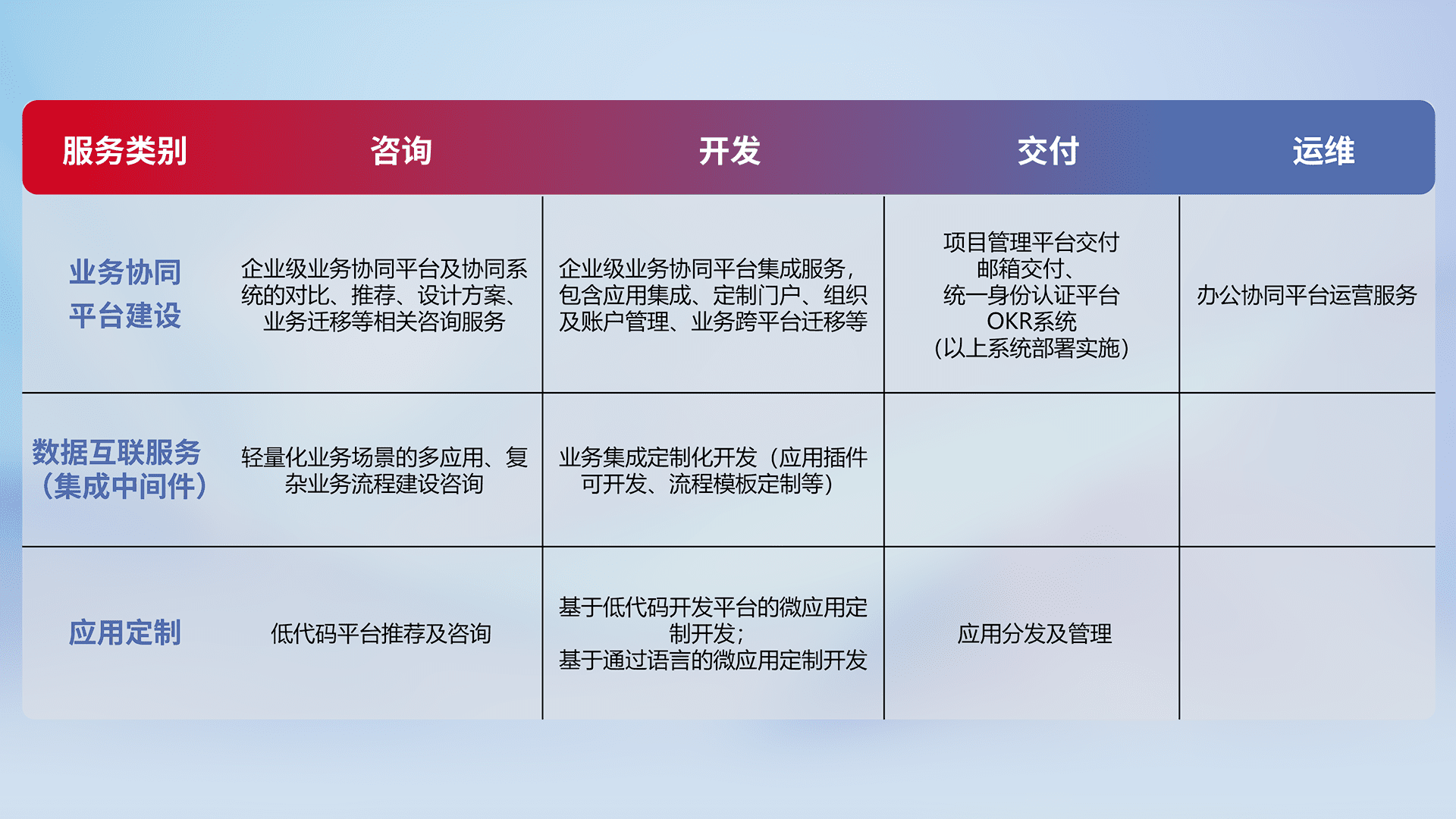 针对钉钉、、、、企微、、IDaas等平台级产品提供产品的规划、、方案、、、、交付、、、、定制化开发等服务,,,实现如统一协同办公、、、、智能客户服务、、、混合会议管理、、智能数据查询、、、等业务场景,,,实现数字化转型。。。